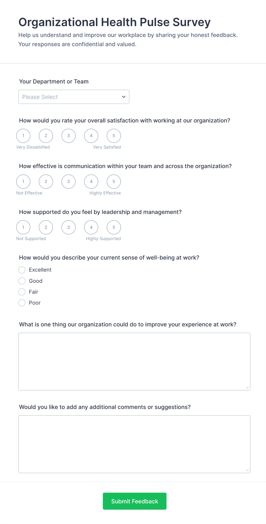 • For onboarding or exit surveys, add fields about the hiring process, training, or reasons for leaving.