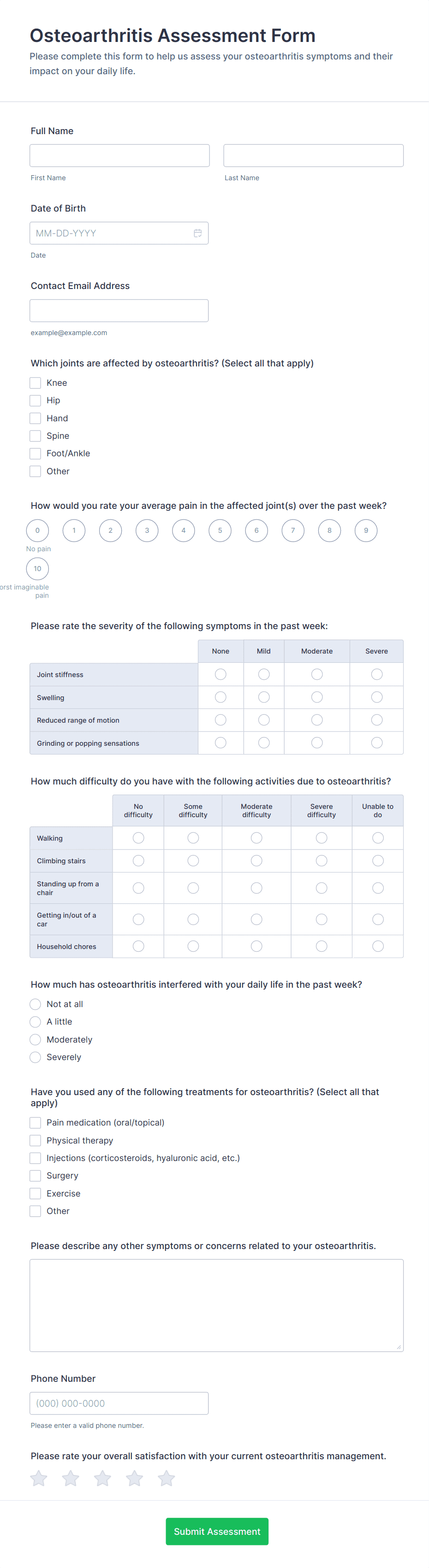 Add fields for symptoms, medical history, medications, allergies, lifestyle factors, and functional status depending on the assessment type. Use rating scales for severity and impact.