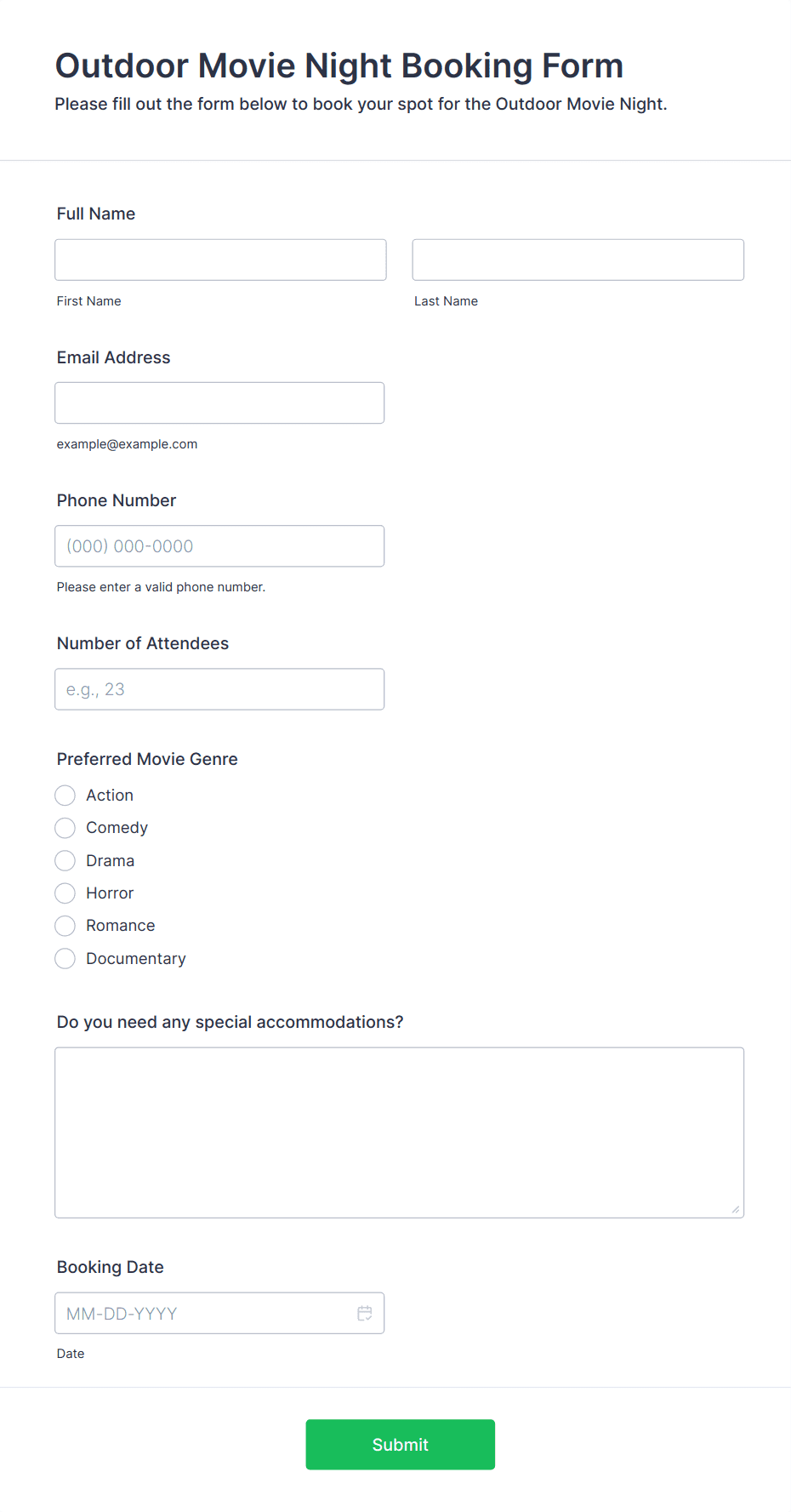 Event Registration Forms are digital tools designed to streamline the process of collecting attendee information for a wide variety of events, such as conferences, workshops, webinars, fundraisers, classes, and social gatherings. These forms allow organizers to gather essential details like participant names, contact information, payment preferences, dietary restrictions, and session selections. By using event registration forms, event planners can efficiently manage RSVPs, track attendance, and ensure a smooth check-in process on the day of the event. The flexibility of these forms makes them suitable for both small private gatherings and large-scale public events, adapting to the unique requirements of each occasion.