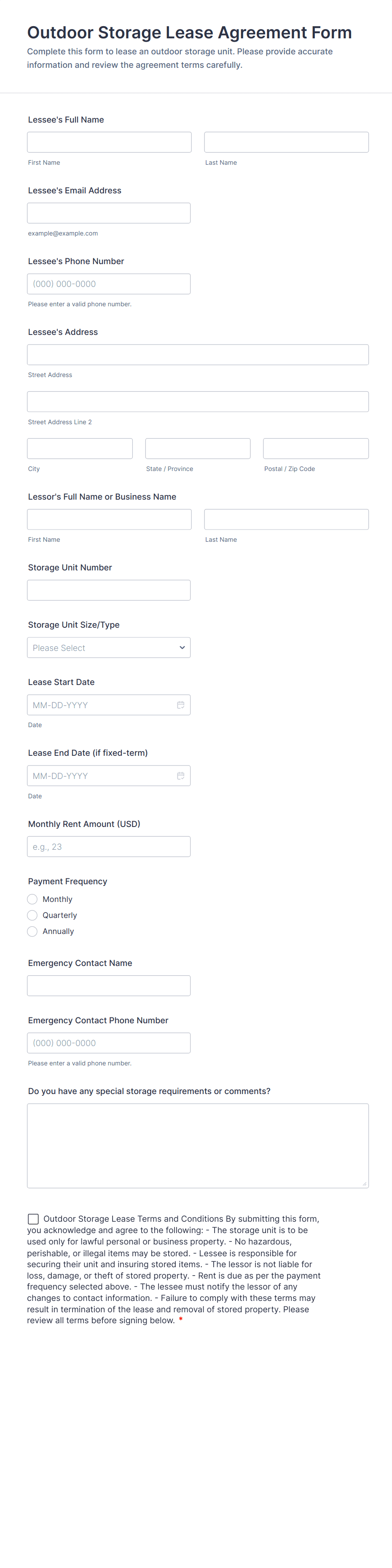 • Maintenance Requests: Tenant name, unit number, issue description, urgency level, file upload for photos.