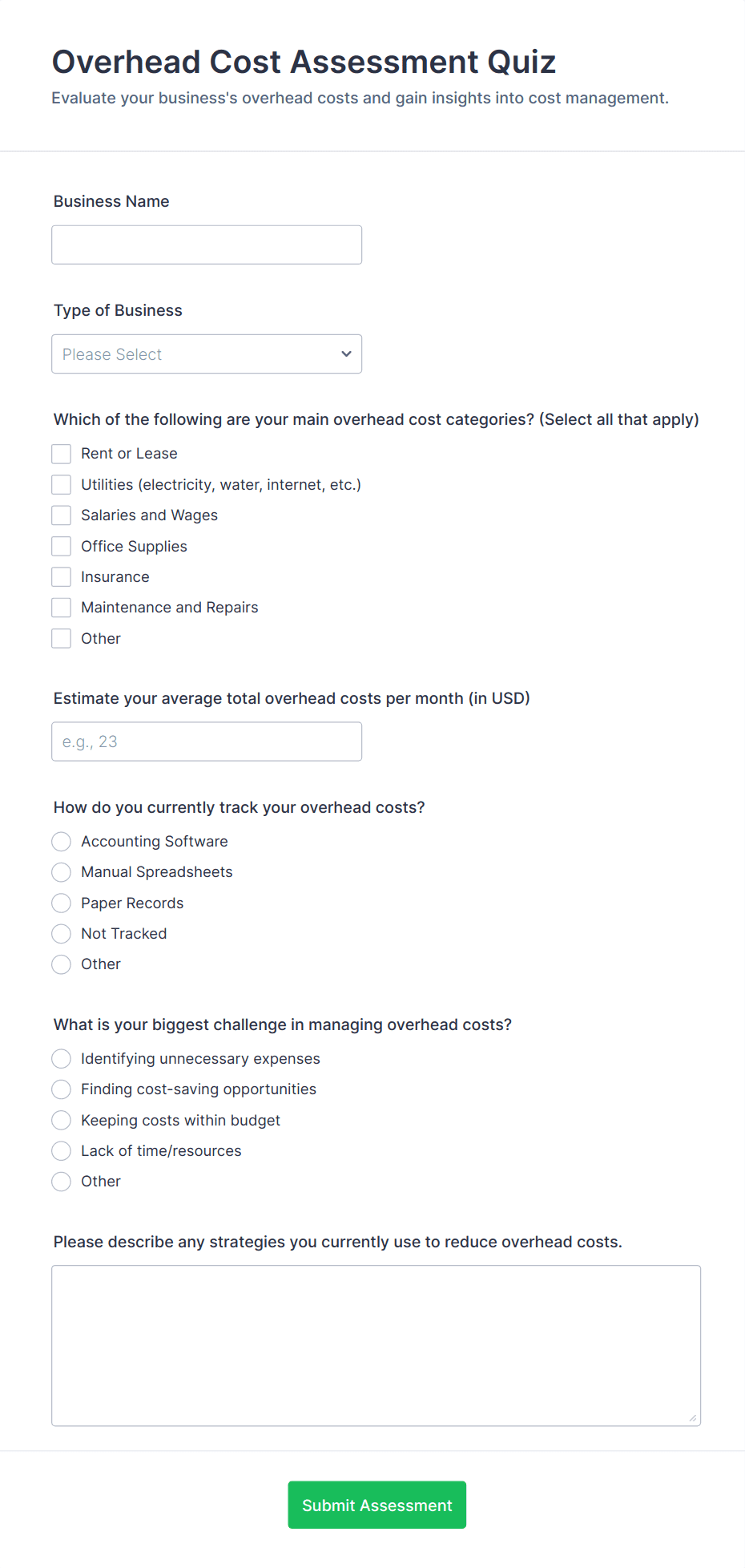Quiz Templates are pre-designed forms specifically created to facilitate the process of building quizzes for a variety of purposes, such as education, employee training, lead generation, event engagement, and more. These templates provide a structured way to present questions, collect answers, and automatically score or evaluate responses. Whether you’re a teacher assessing student knowledge, a business running a product knowledge test, or a marketer creating a fun personality quiz, Quiz Templates offer a flexible foundation to suit your needs. They can be used for online exams, trivia games, onboarding assessments, customer feedback quizzes, and interactive learning modules.