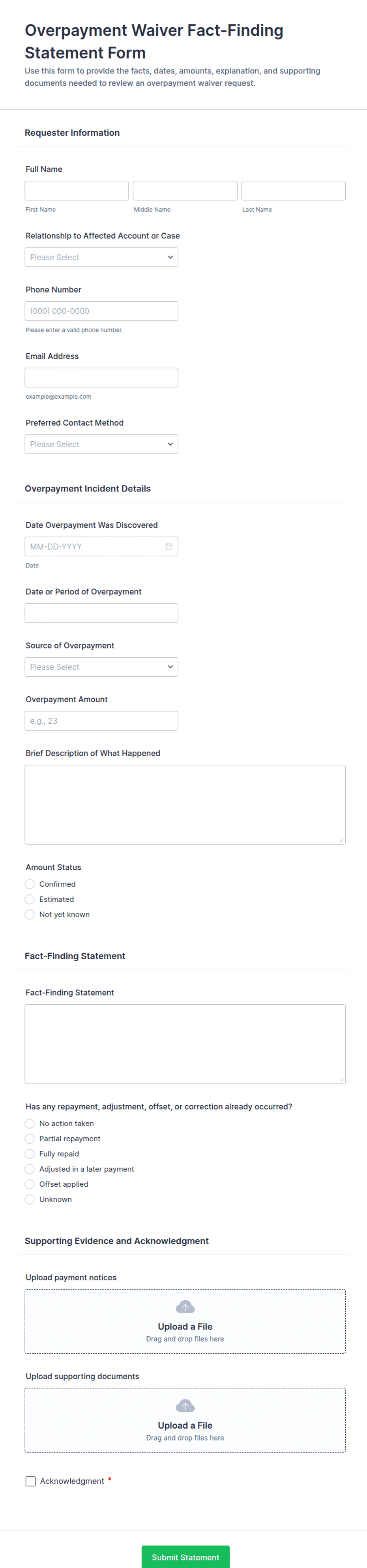 - File upload fields for supporting documents (receipts, photos, reports)