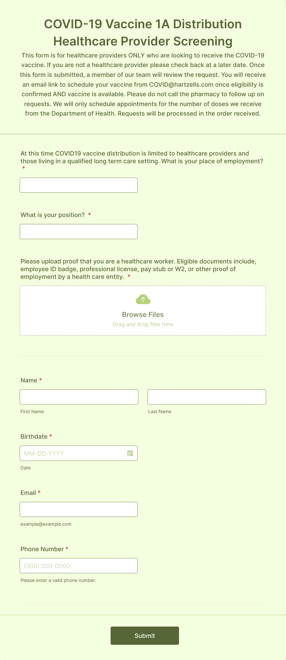 Collect COVID-19 vaccine registrations online. Fill out on any device. Easy to customize, share, and embed. Convert submissions to PDFs instantly. HIPAA friendly features option.