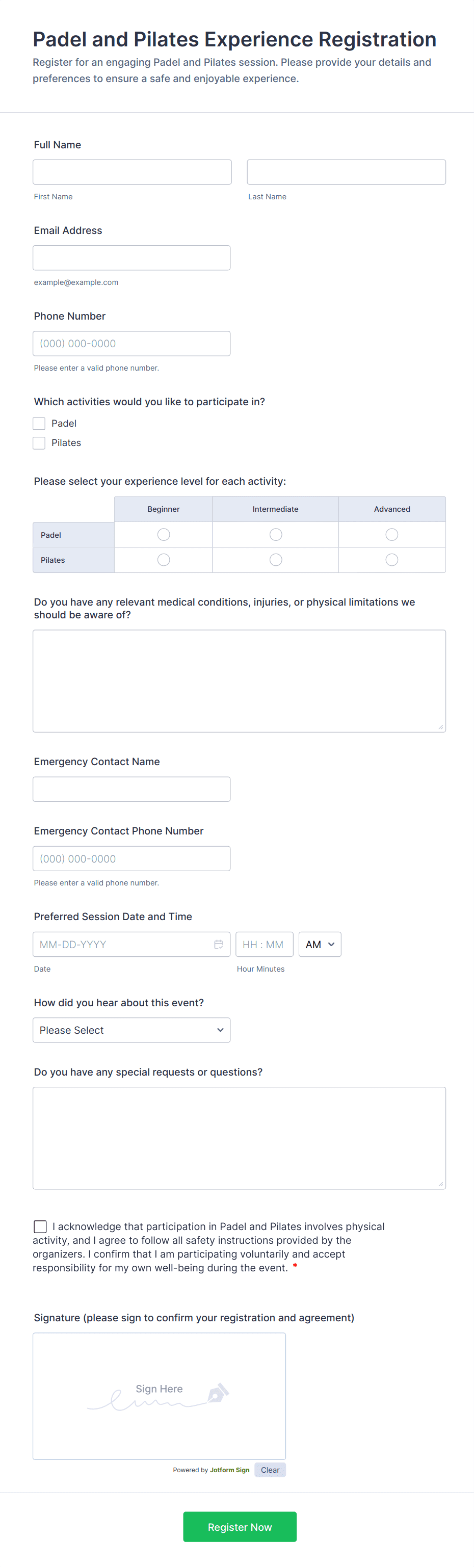 To get started, consider the specific requirements of your event. Think about the information you need to collect, such as attendee names, contact details, payment information, session preferences, and any special requests. Jotform’s flexible platform allows you to build your form from scratch or use one of the many event registration templates available.