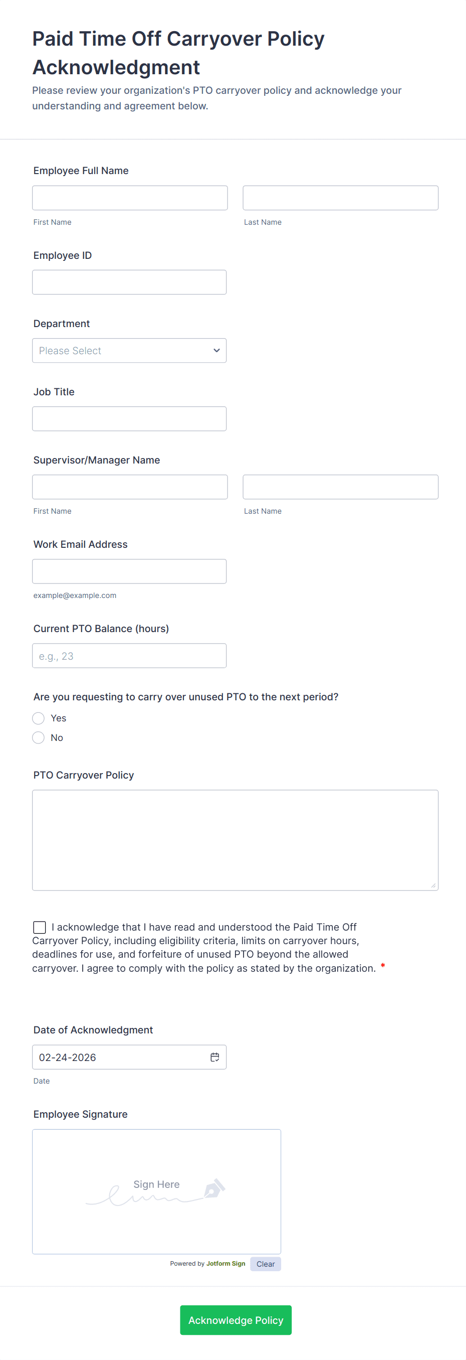 The template allows getting instant leave requests from employees with all relevant information that is needed. You can add more customized fields with Jotform.