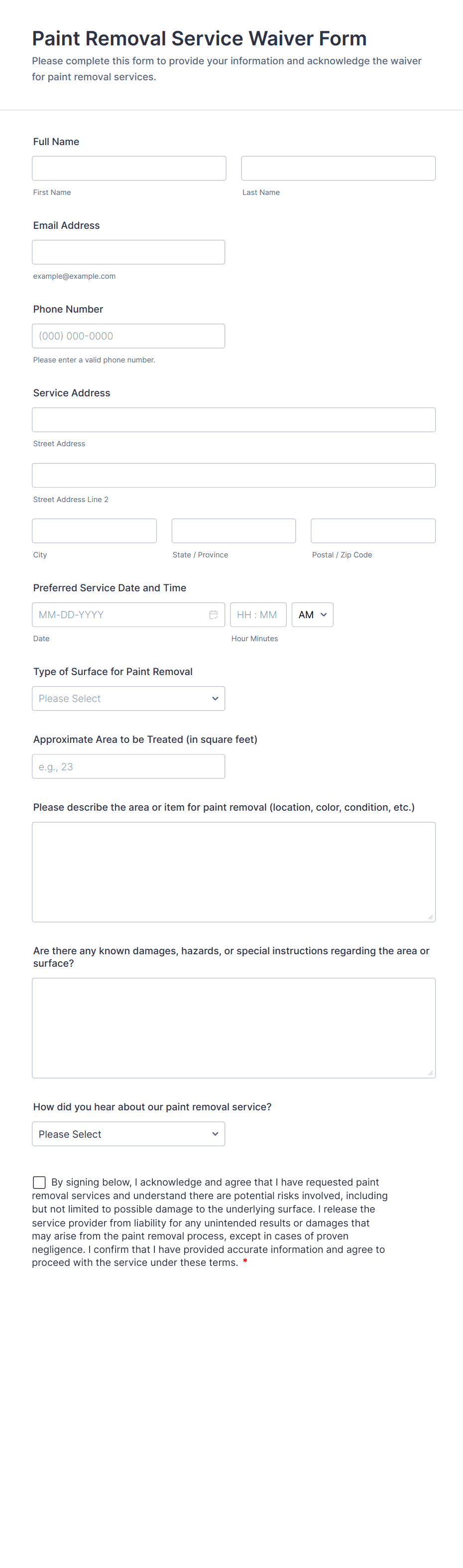 Waiver forms are legal documents designed to obtain consent from individuals, releasing an organization or individual from liability for potential risks or damages associated with a specific activity, service, or event. Commonly used in industries such as fitness, sports, healthcare, education, and event management, waiver forms help protect businesses and organizations by ensuring participants acknowledge and accept the inherent risks involved. Use cases range from gym membership waivers and medical procedure consents to field trip permissions and event participation releases. By clearly outlining the terms and conditions, waiver forms help establish mutual understanding and safeguard both parties.