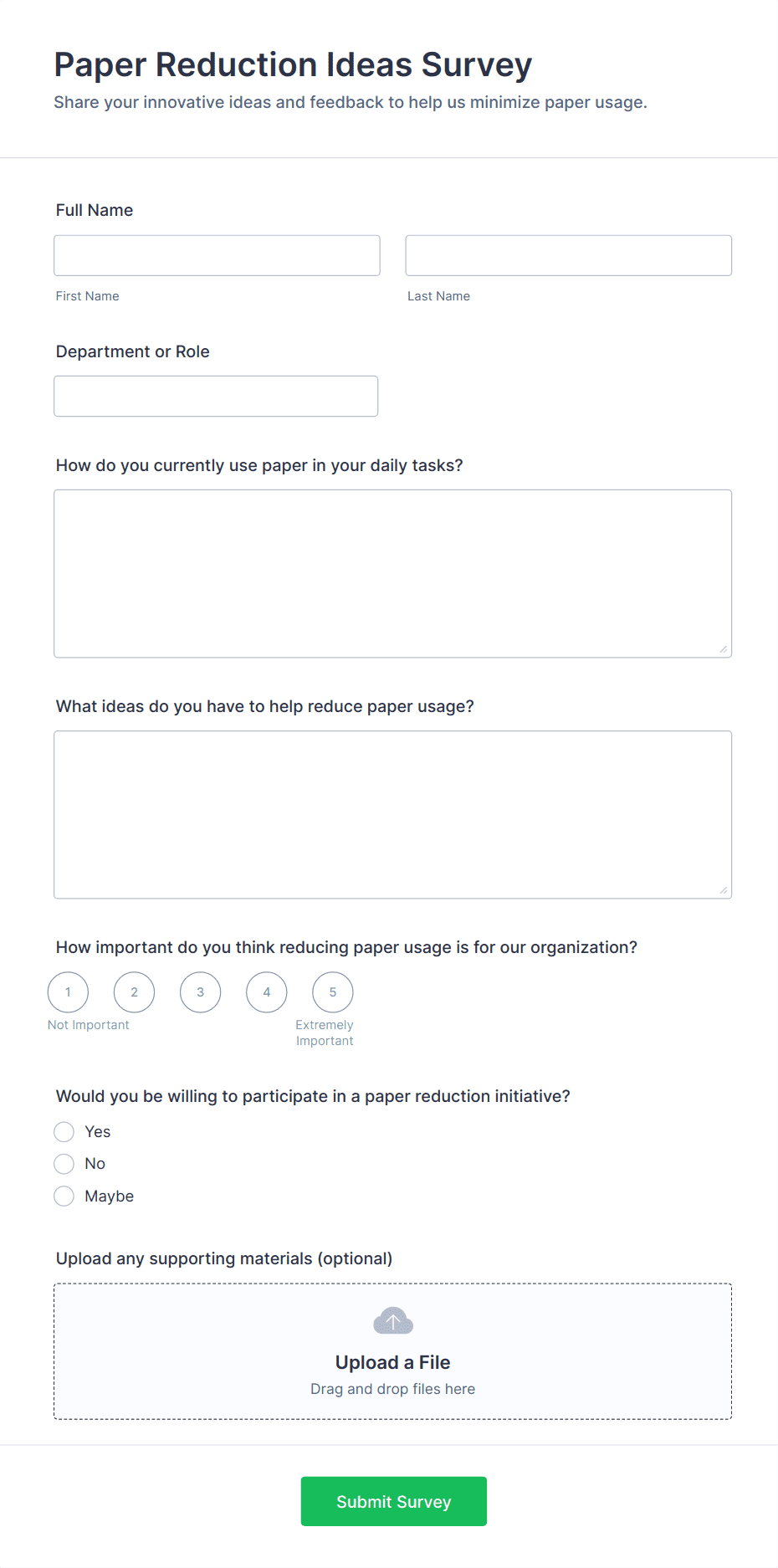 For employee surveys, consider adding anonymity options; for customer surveys, include contact fields if follow-up is needed.