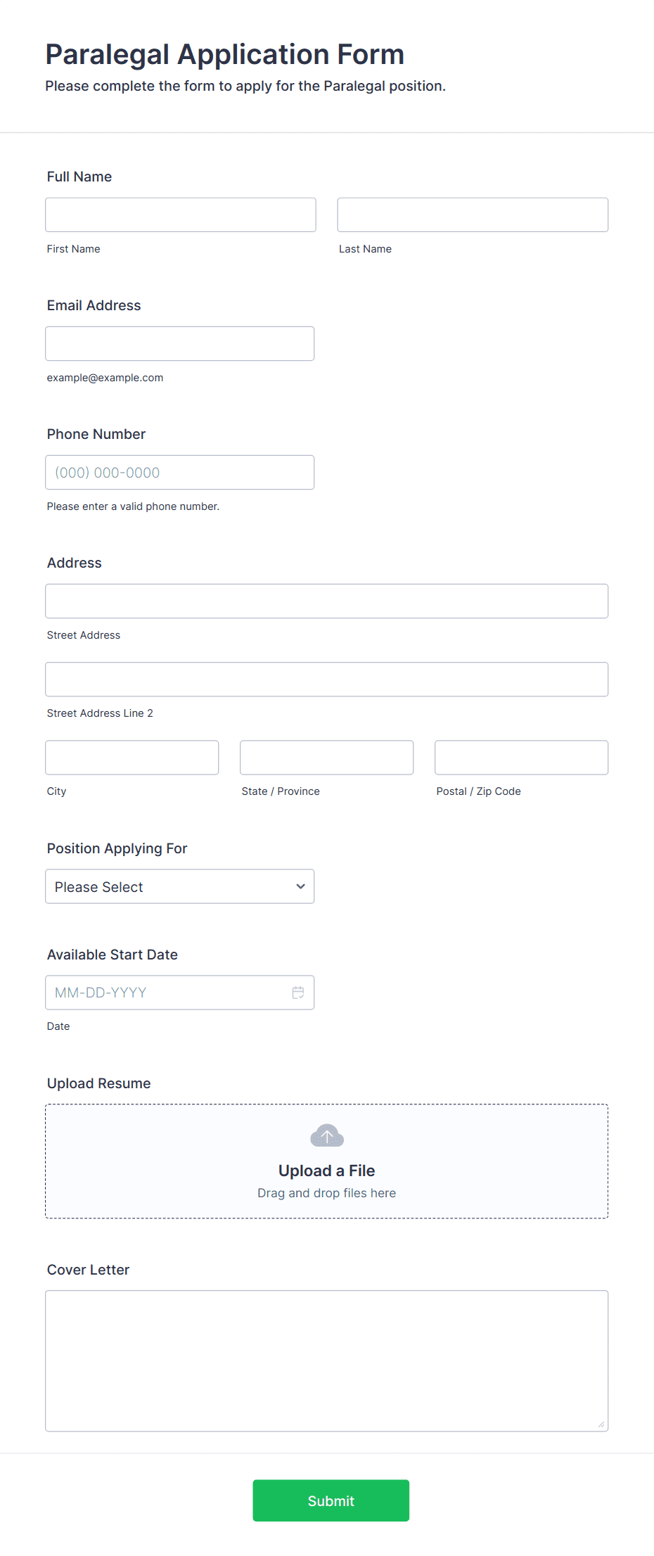 • For job applications, include fields for personal information, education, work experience, references, and file uploads for resumes or cover letters.