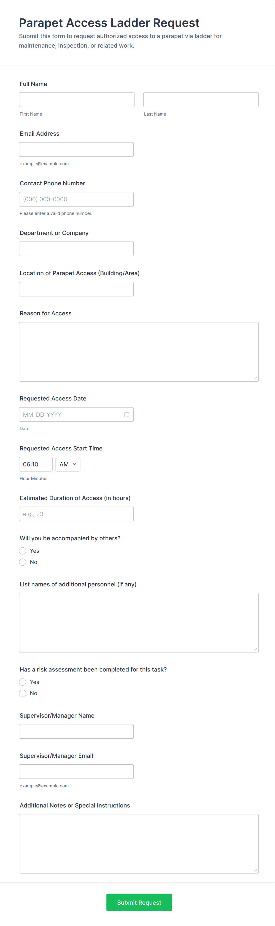 Building Entry Pass Request Form helps offices, campuses, and secured facilities collect visitor details, visit purpose, and entry time online for organized access control and visitor management.