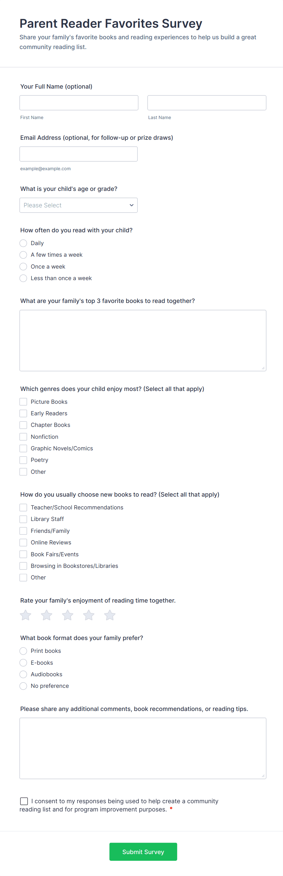 Collect family reading preferences and habits with the Parent Reader Favorites Survey in Jotform, ideal for schools, libraries, and literacy programs that want better data collection and easier form submission tracking.