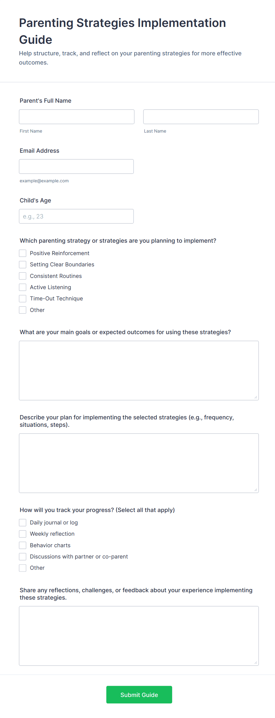 Parenting Strategies Implementation Guide Form helps parents, caregivers, and family professionals plan, track, and reflect on parenting approaches and goals using a customizable Jotform template.