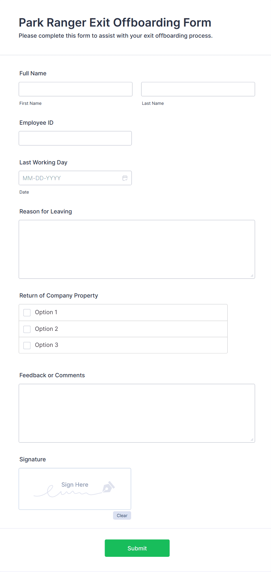 The Employee Exit Offboarding Form helps HR departments collect essential information from departing employees, ensuring smooth transitions and valuable feedback for organizational improvement.