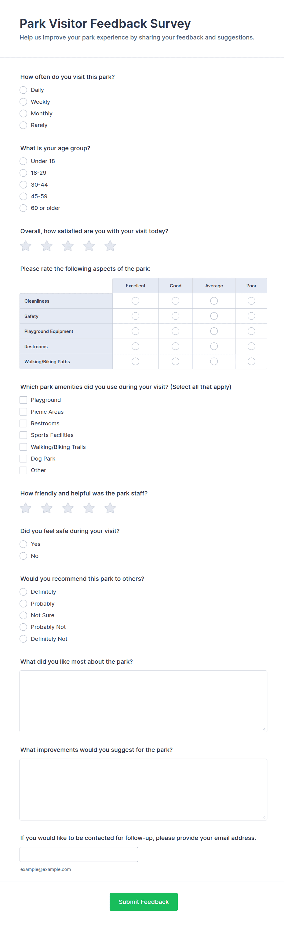 Typical feedback forms include rating scales, multiple choice questions, open-ended comment sections, and optional contact information for follow-up.