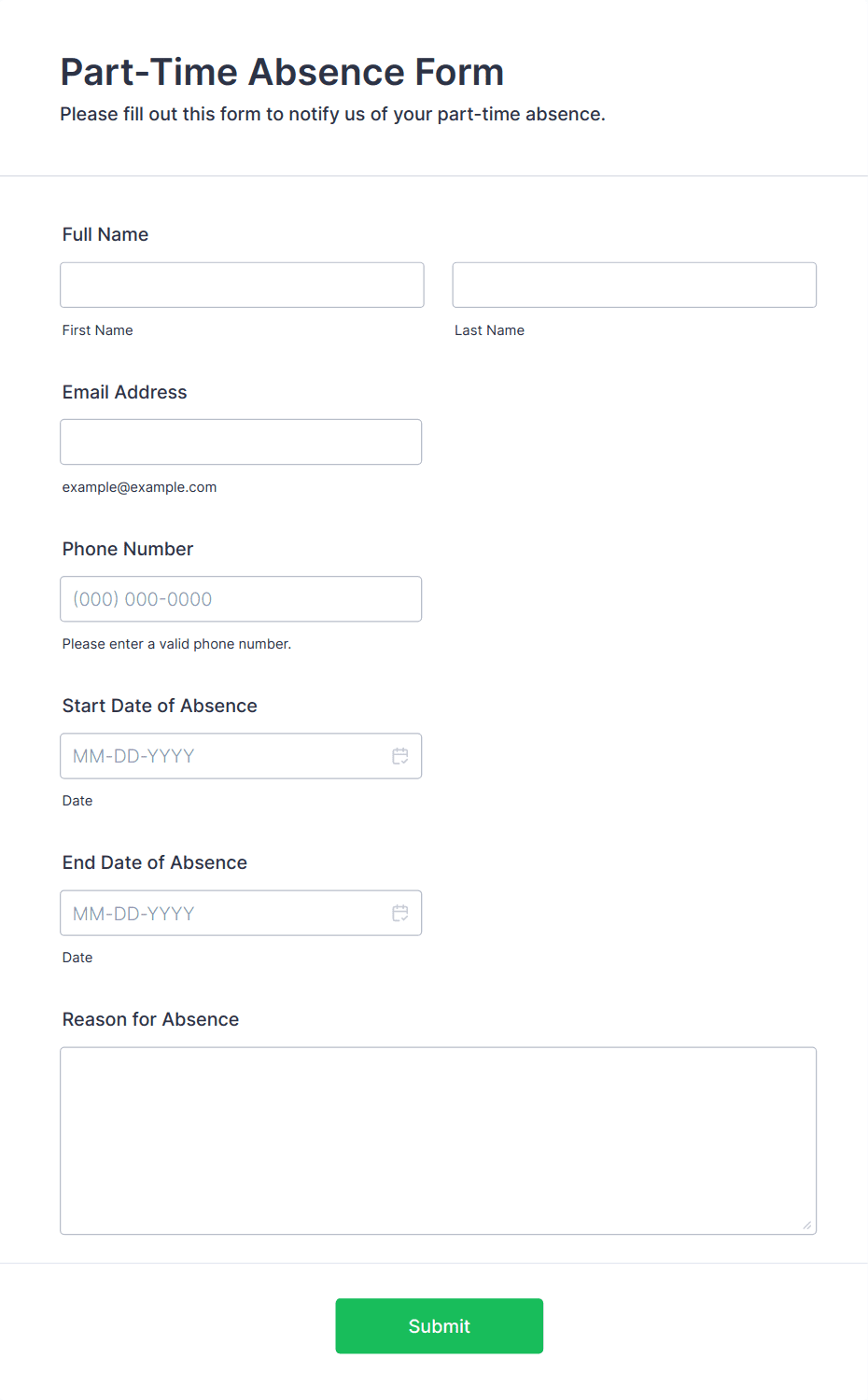 Common fields include employee name, department, type of leave, dates of absence, reason for leave, and any required supporting documentation.
