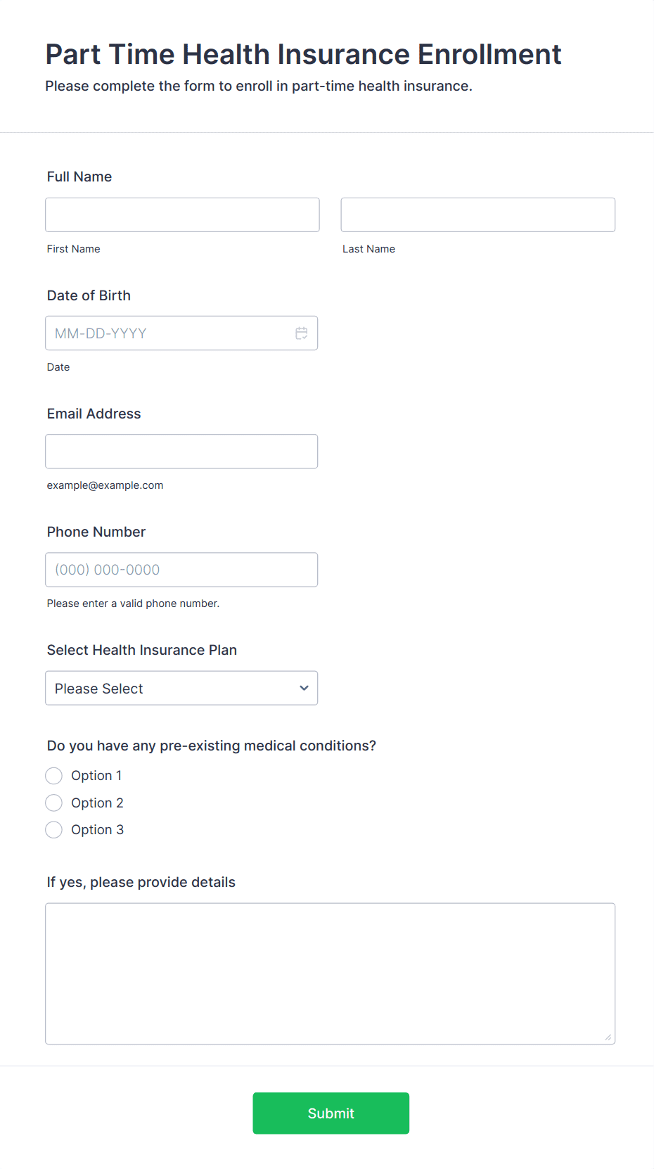 The Part Time Health Insurance Enrollment Form is a Jotform Form Builder form template that streamlines data collection and form submission for part-time employee benefits enrollment with a drag-and-drop interface and no-code form builder tools.