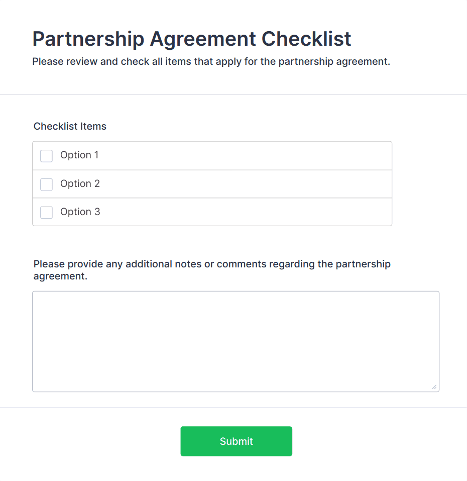 The form templates here are for informational purposes only. Jotform is not providing legal, financial, or other advice, or implying that the forms are legally valid in all or any jurisdictions. Before using any such form, consult an attorney and/or other applicable professionals to make sure that the form meets your needs, legally and otherwise.