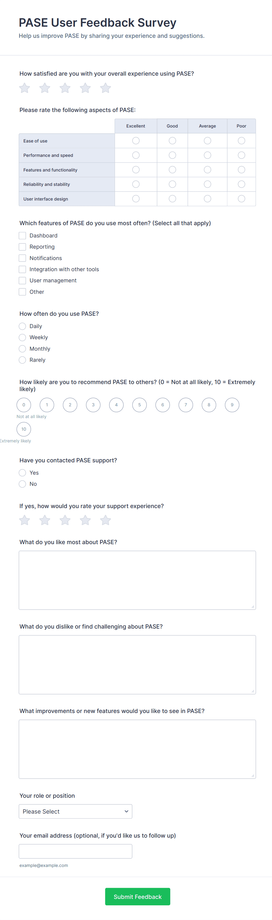 • Short and long text fields for open-ended feedback.