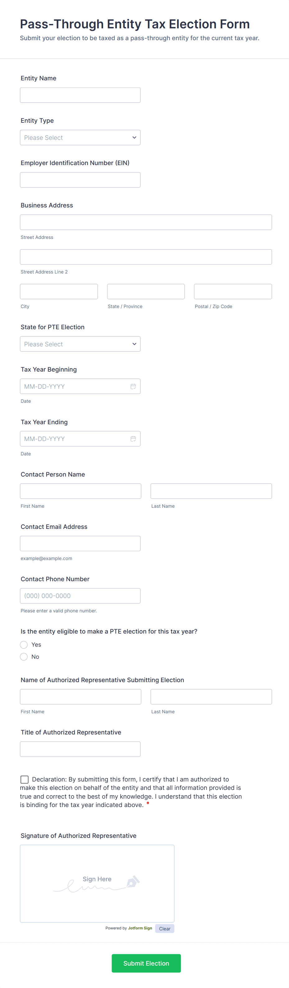 Whether you’re a government agency collecting official tax forms or an accountant gathering information from your clients, securely receive tax information online with Jotform’s Tax Forms! Start by selecting a form template below and customizing it to match your needs and branding. Then share the form or embed it in your website to be filled out on any smartphone, tablet, or computer. Submissions are stored in your secure Jotform account and can be converted into professional PDF documents automatically.