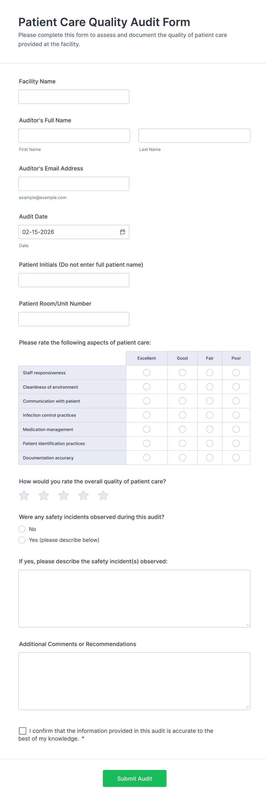 - Customize fields based on your audit type (e.g., safety, quality, compliance).