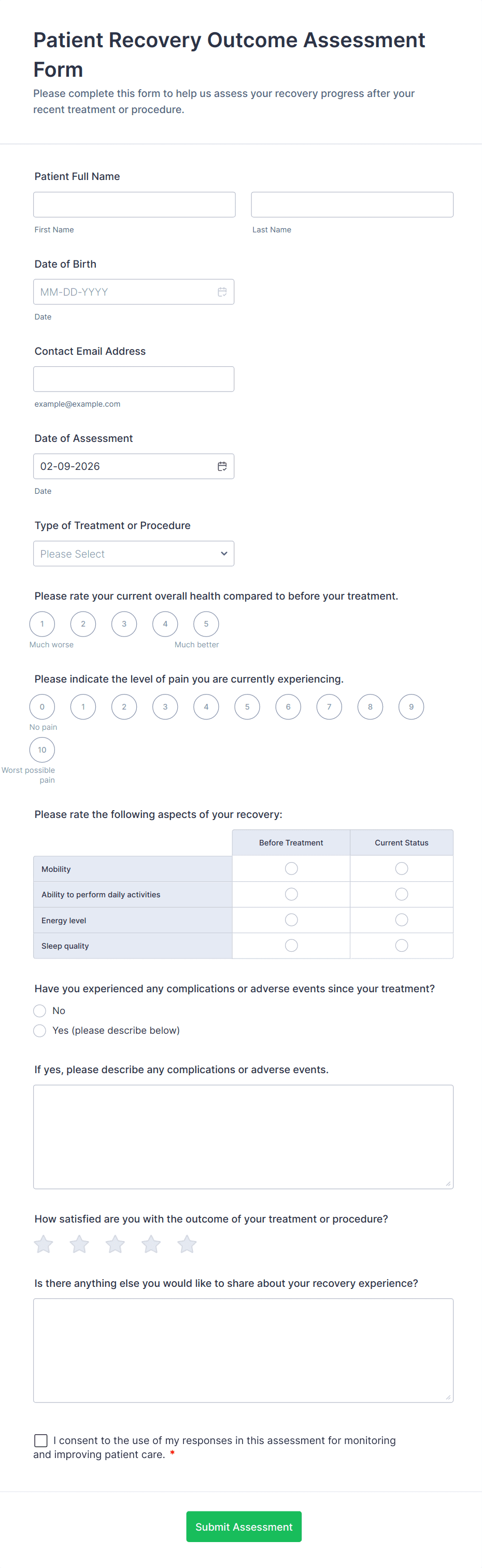 Healthcare assessment forms are structured documents used to collect and evaluate patient health information to support clinical decisions, care planning, and ongoing monitoring. They help healthcare teams capture consistent details about symptoms, medical history, risk factors, functional status, and care needs in a clear and organized way. Healthcare assessment forms are commonly used in clinics, hospitals, telehealth services, rehabilitation centers, home care, and specialty practices for intake assessments, screening evaluations, follow-up check-ins, and condition monitoring. By standardizing assessment workflows, these forms improve documentation quality, reduce missing information, and support safer, more coordinated care.