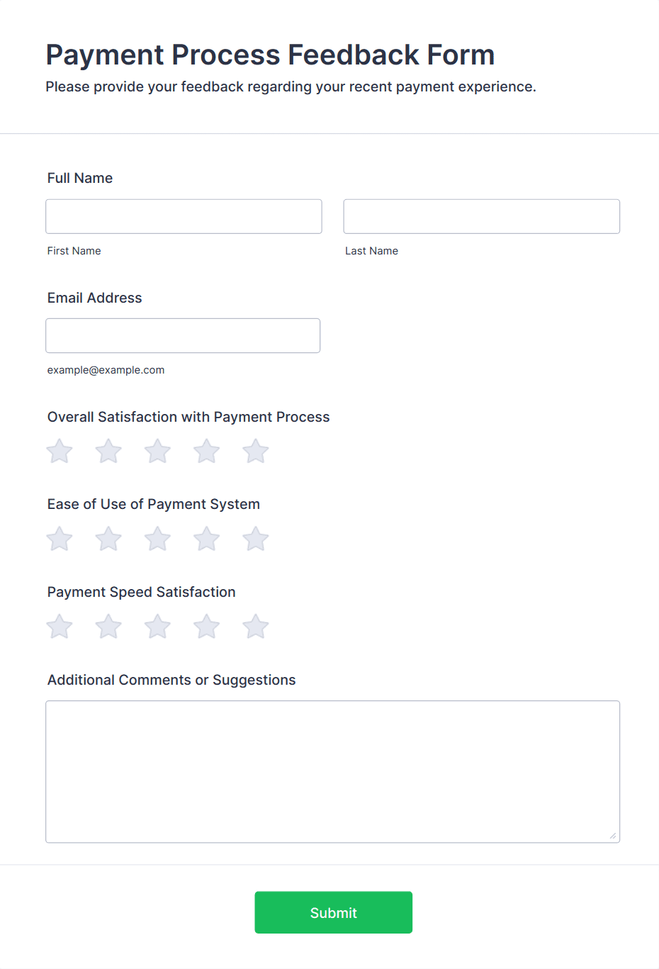 • Product feedback forms may include questions about usability, features, and likelihood to recommend.