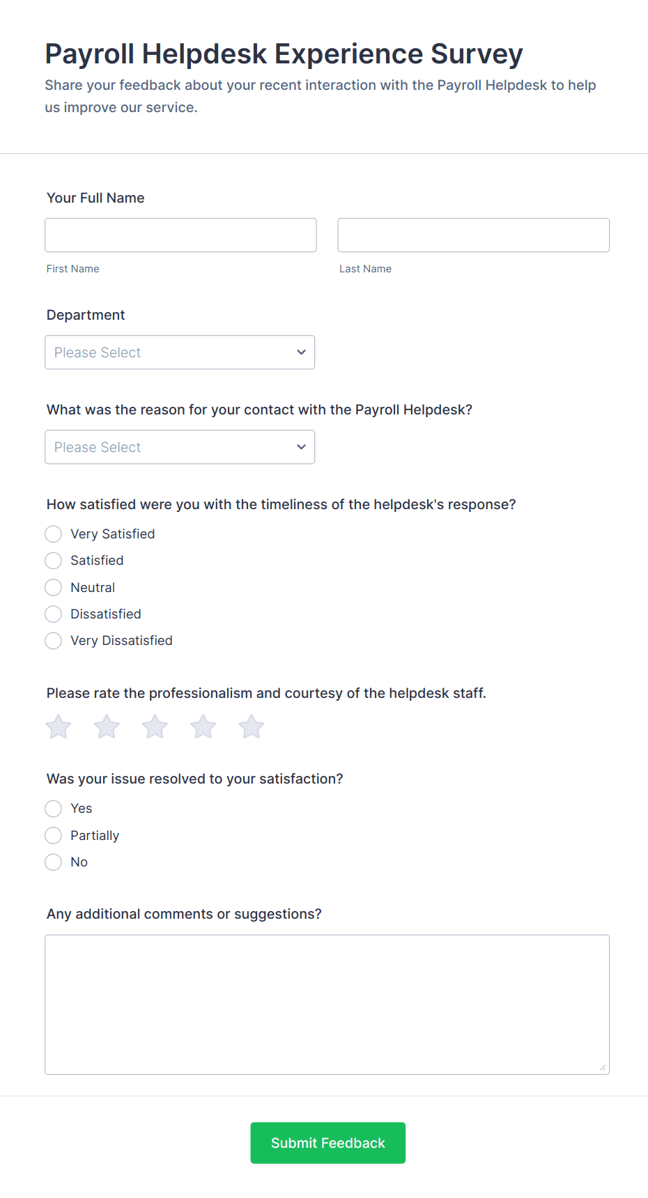 • For onboarding or exit surveys, add fields about the hiring process, training, or reasons for leaving.