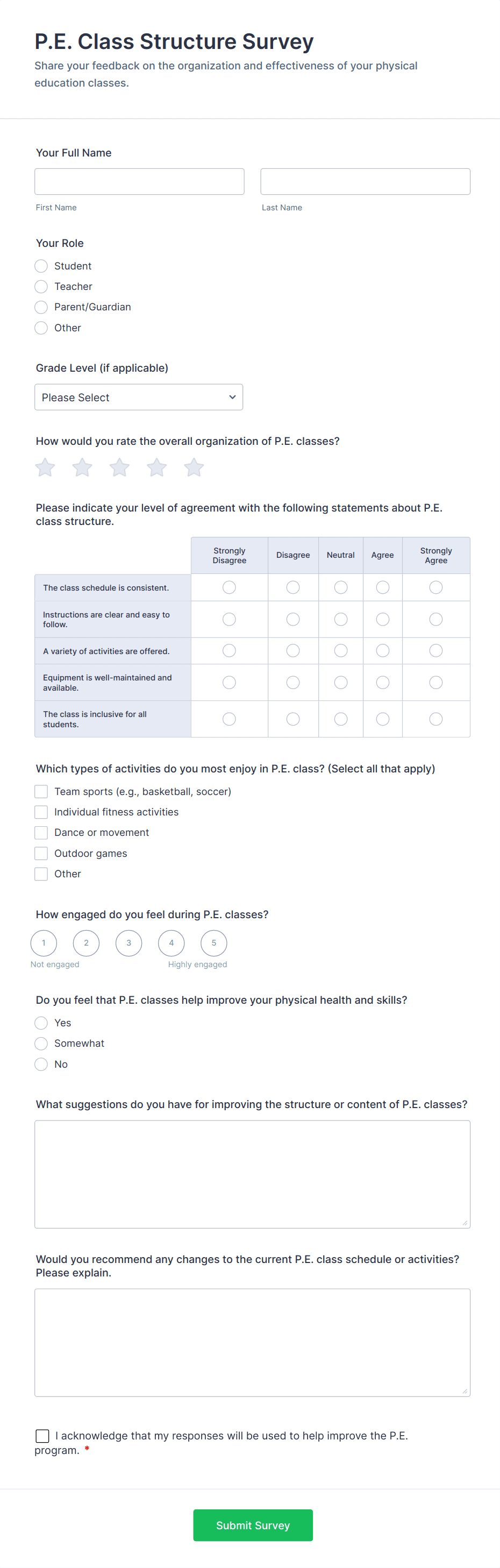 - For student or parent surveys, add questions about satisfaction, communication, and support services.