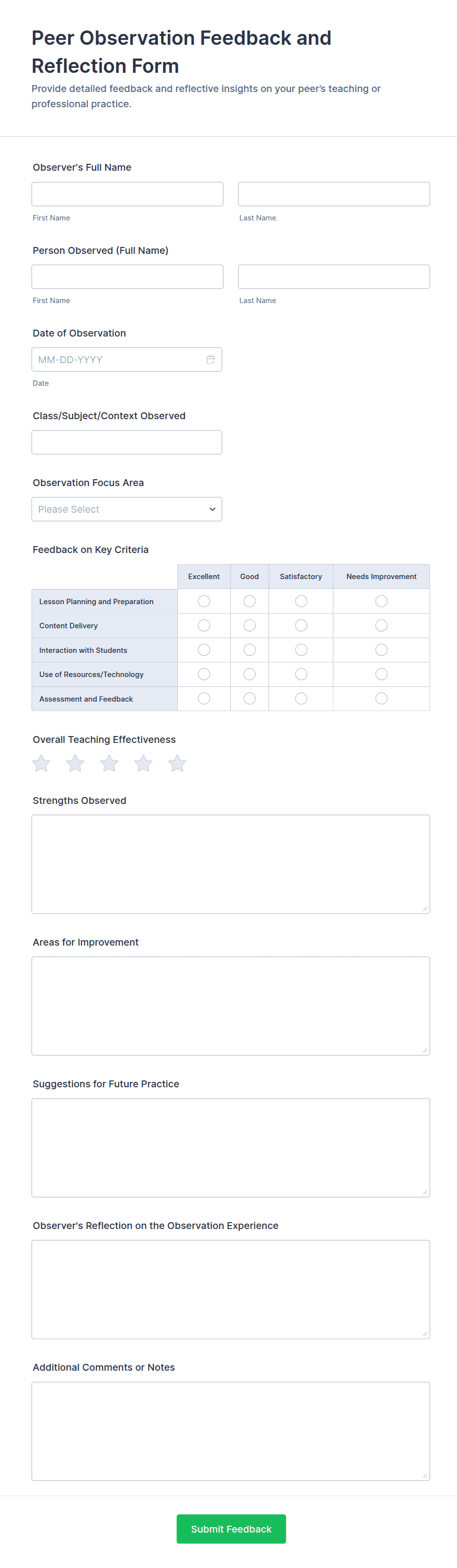- Peer Evaluation Forms: Include detailed observation checklists and open-ended comment sections.