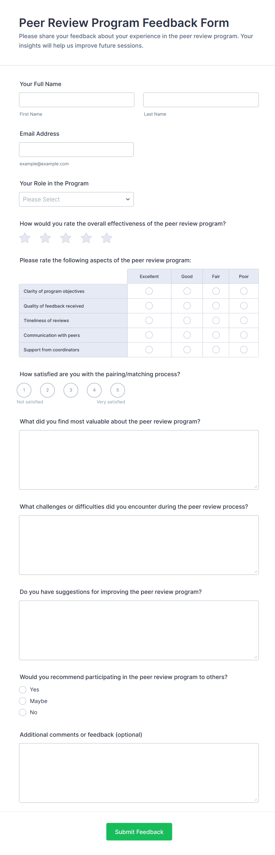 By following these steps, you can create a peer feedback form that is tailored to your specific scenario, encourages honest and constructive input, and streamlines the feedback process for all participants.