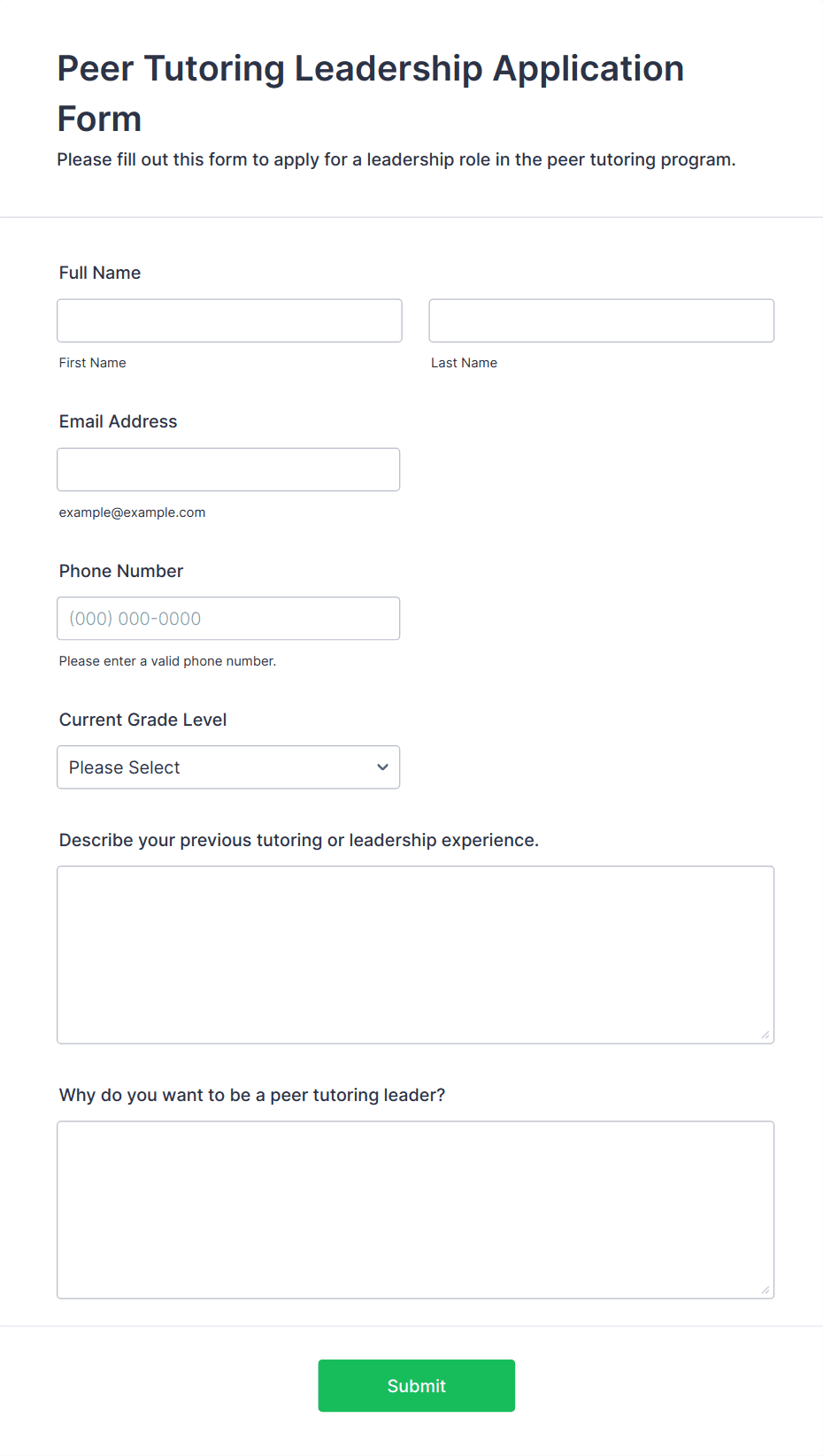 The Peer Tutoring Leadership Application Form is used to collect applications from students who want to serve as peer tutoring leaders, capturing their academic strengths, experience, and availability in a structured online form submission.