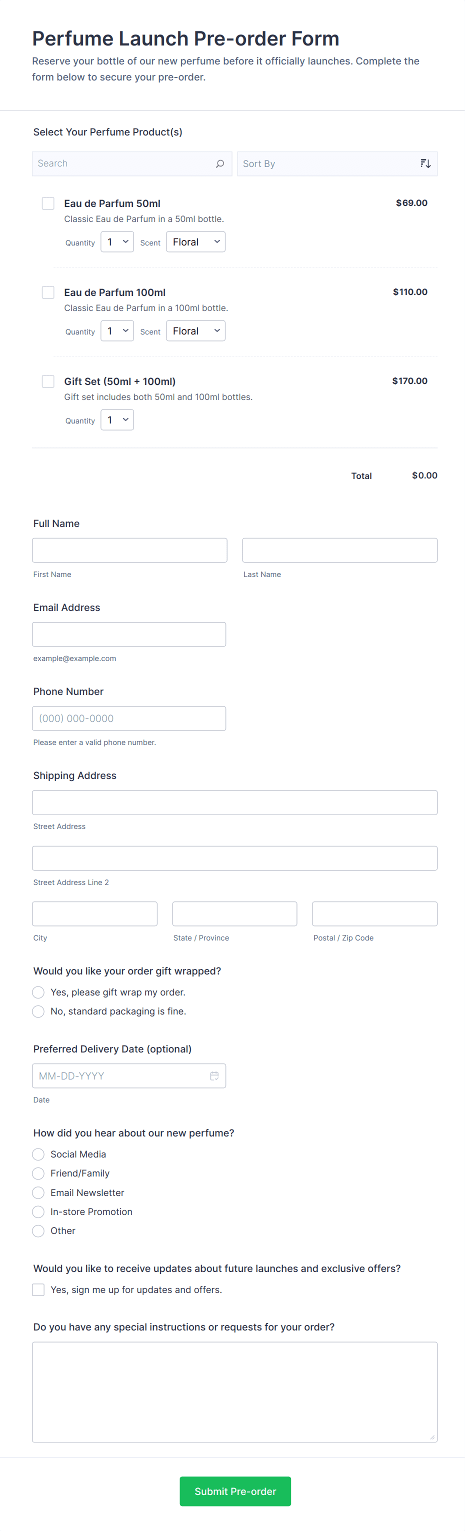 Preorder forms are specialized online forms designed to collect advance orders for products or services before they are officially released or available for general sale. Businesses, creators, and organizations use preorder forms to gauge demand, secure early sales, and streamline inventory planning for upcoming launches. These forms are commonly used for new product releases, limited-edition items, event tickets, seasonal goods, or even digital content. By allowing customers to reserve or purchase items ahead of time, preorder forms help businesses manage expectations, reduce the risk of overproduction, and build excitement around new offerings.