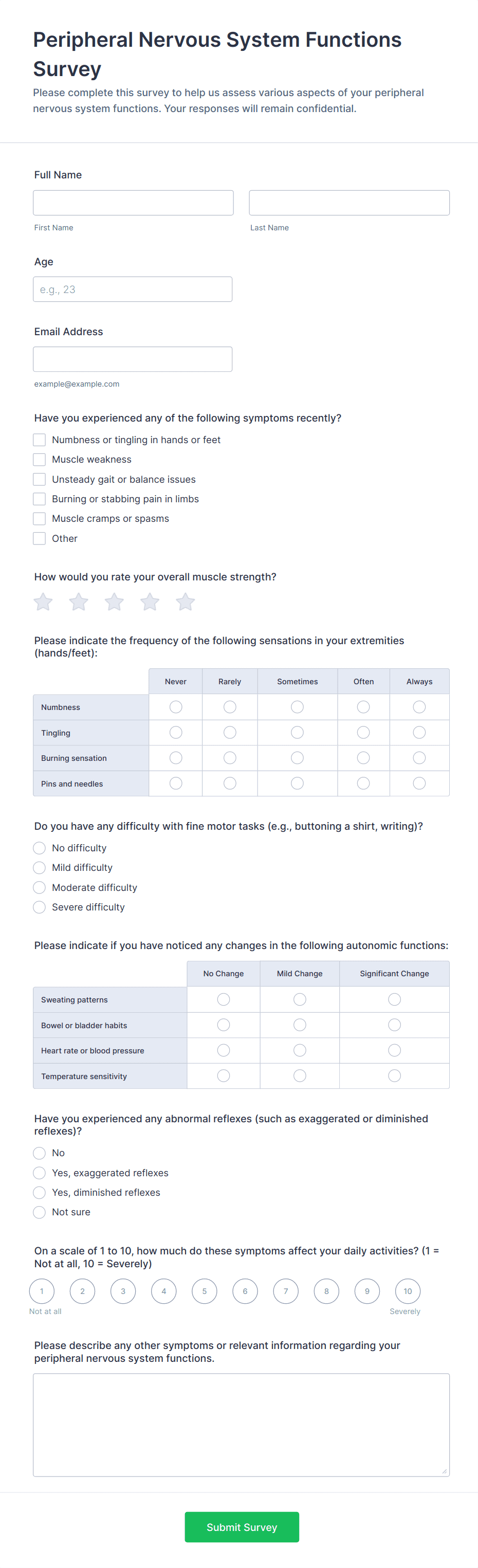Medical surveys and questionnaires are essential tools used by healthcare professionals, researchers, clinics, and organizations to collect valuable information about patients’ health, medical histories, symptoms, treatment outcomes, and overall well-being. These forms can be used for a variety of purposes, such as patient intake, health risk assessments, satisfaction surveys, mental health screenings, post-visit feedback, and clinical research studies. By gathering structured data directly from patients or study participants, medical surveys and questionnaires help streamline workflows, improve patient care, and support evidence-based decision-making in healthcare settings.