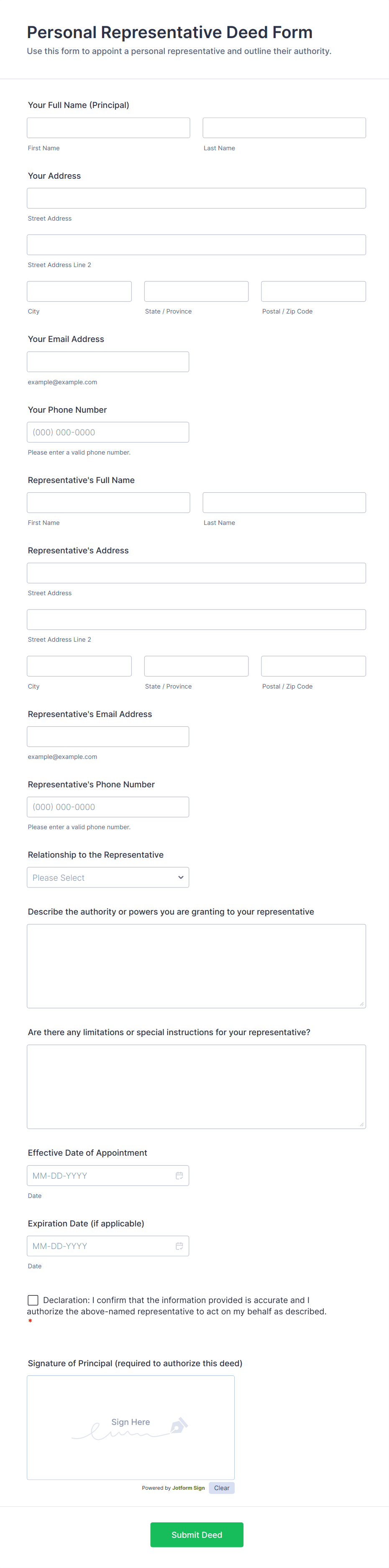 The form templates here are for informational purposes only. Jotform is not providing legal, financial, or other advice, or implying that the forms are legally valid in all or any jurisdictions. Before using any such form, consult an attorney and/or other applicable professionals to make sure that the form meets your needs, legally and otherwise.