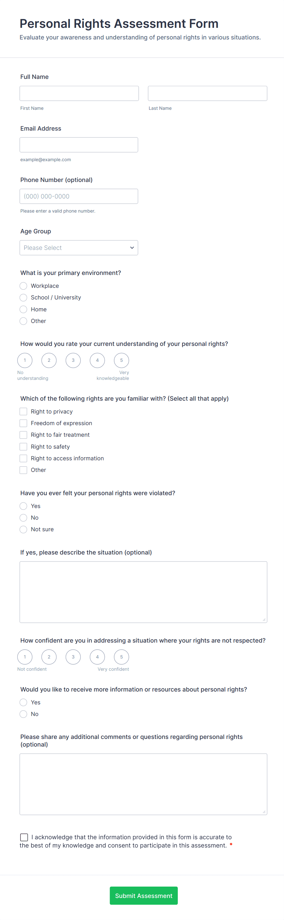 Assessment forms may include personal details, multiple-choice or open-ended questions, rating scales, comment sections, and sometimes automated scoring or feedback fields, depending on the purpose.