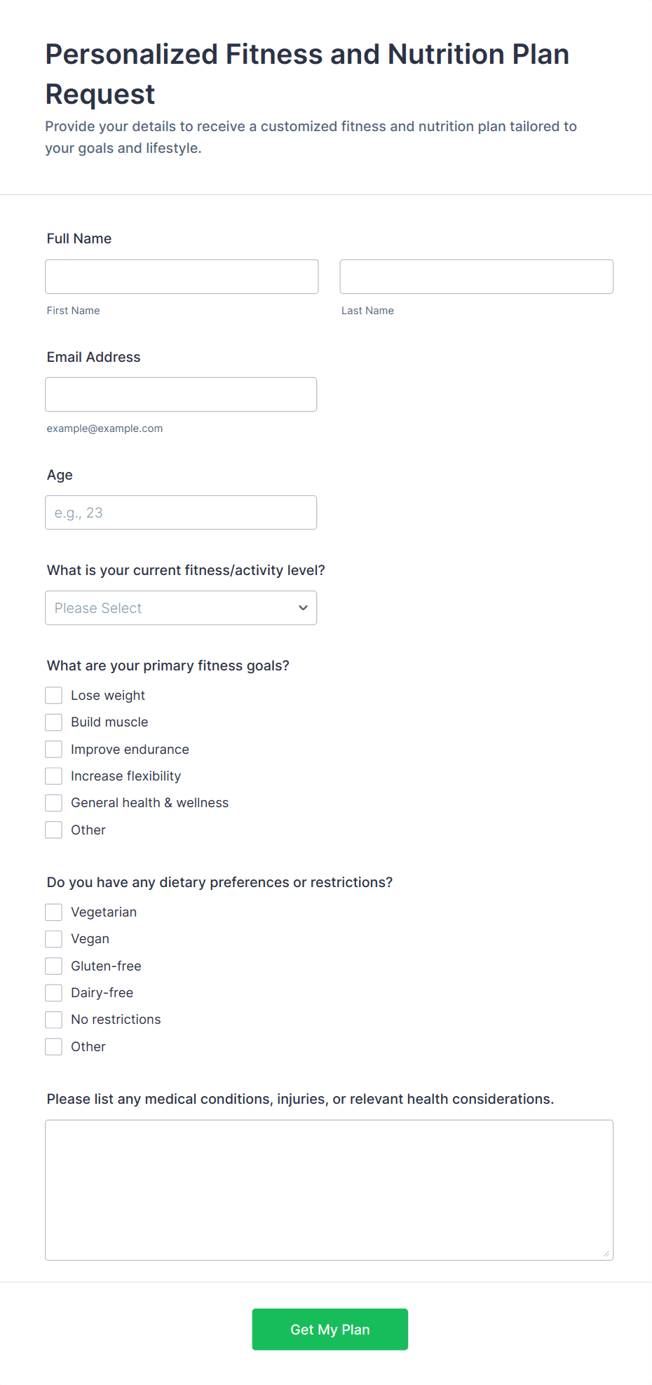 Are you a health coach looking for a convenient way to gather information from your patients? Streamline your intake process with these free Health Coach Forms from Jotform. Choose a form template below to start collecting responses from questionnaires, surveys, and patient health assessments from any device. Customize your forms without any coding with Jotform’s intuitive form builder. Simply drag and drop to add form elements, edit text fields and checklist items, upload your personal branding, and much more. Go paperless and securely collect and store patient data online with a fully-customizable Health Coach Form.