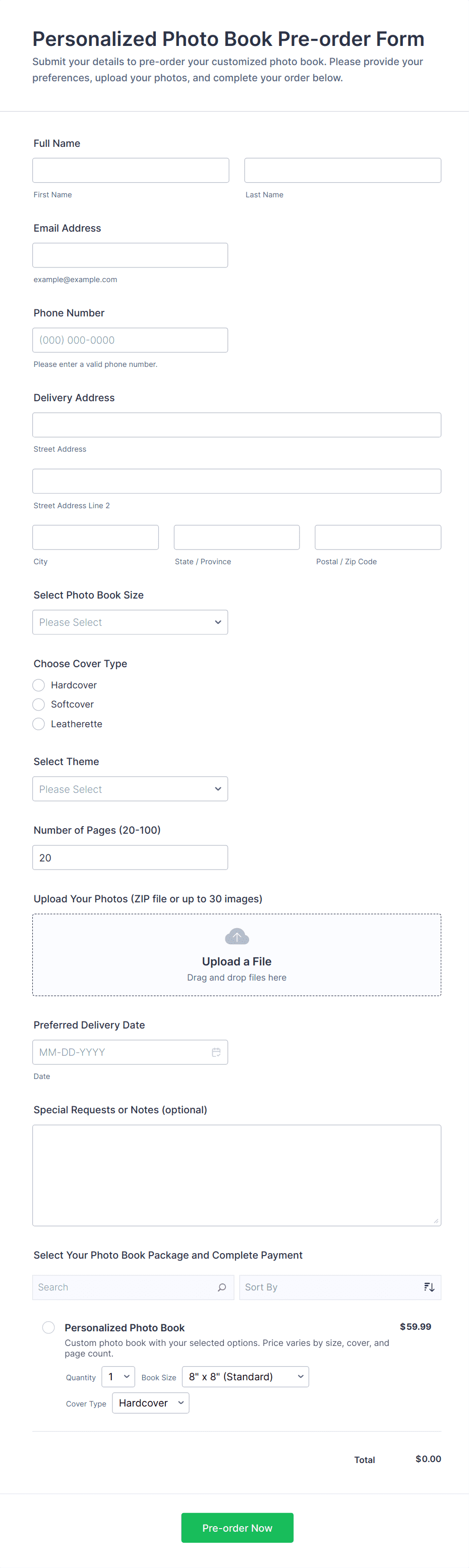 Embed a free Pre-Order Form Template in your store’s website to instantly process product pre-orders online. Free to use, easy to customize!