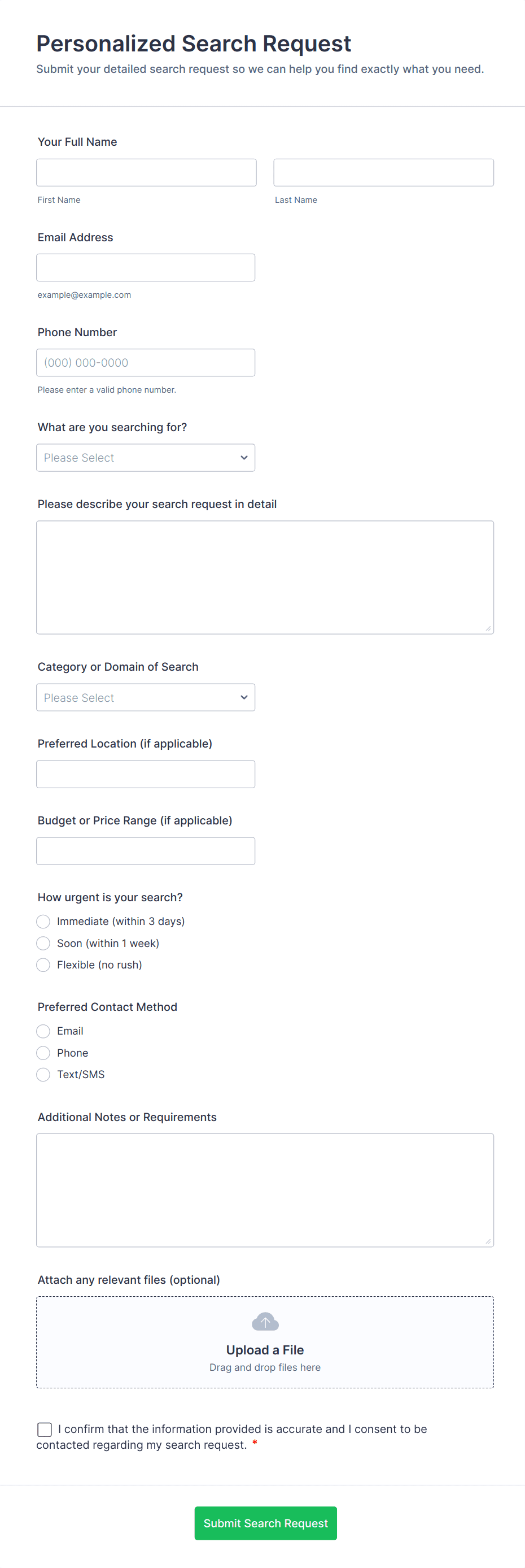 Information request forms are digital tools designed to collect specific details from individuals or organizations for a variety of purposes. These forms are commonly used by businesses, educational institutions, healthcare providers, government agencies, and nonprofits to gather essential information such as contact details, service inquiries, feedback, or documentation requests. Whether you need to process customer queries, handle support tickets, collect research data, or manage internal requests, information request forms streamline the process by providing a structured and efficient way to capture and organize incoming data.
