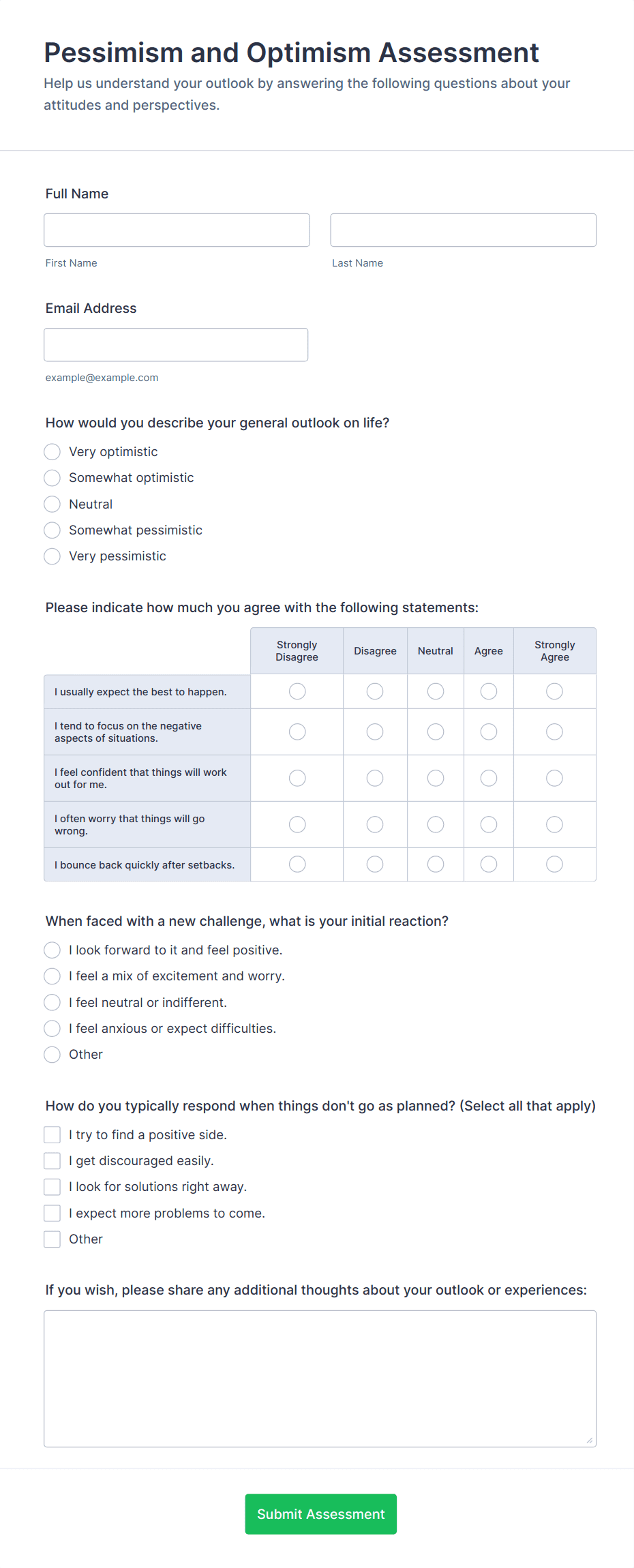 Use the Inner Child Assessment Form from Jotform to gather reflective responses about emotional well-being and childhood memories, built with Jotform Form Builder for easy no-code customization and secure data collection.
