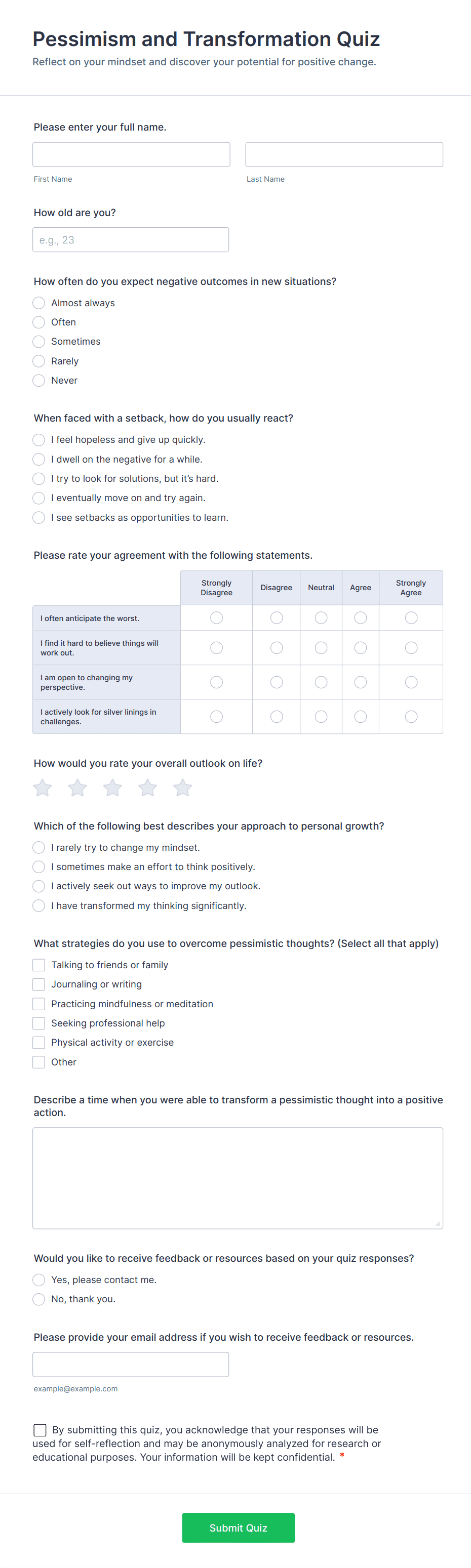 Quiz Templates are pre-designed forms specifically created to facilitate the process of building quizzes for a variety of purposes, such as education, employee training, lead generation, event engagement, and more. These templates provide a structured way to present questions, collect answers, and automatically score or evaluate responses. Whether you’re a teacher assessing student knowledge, a business running a product knowledge test, or a marketer creating a fun personality quiz, Quiz Templates offer a flexible foundation to suit your needs. They can be used for online exams, trivia games, onboarding assessments, customer feedback quizzes, and interactive learning modules.