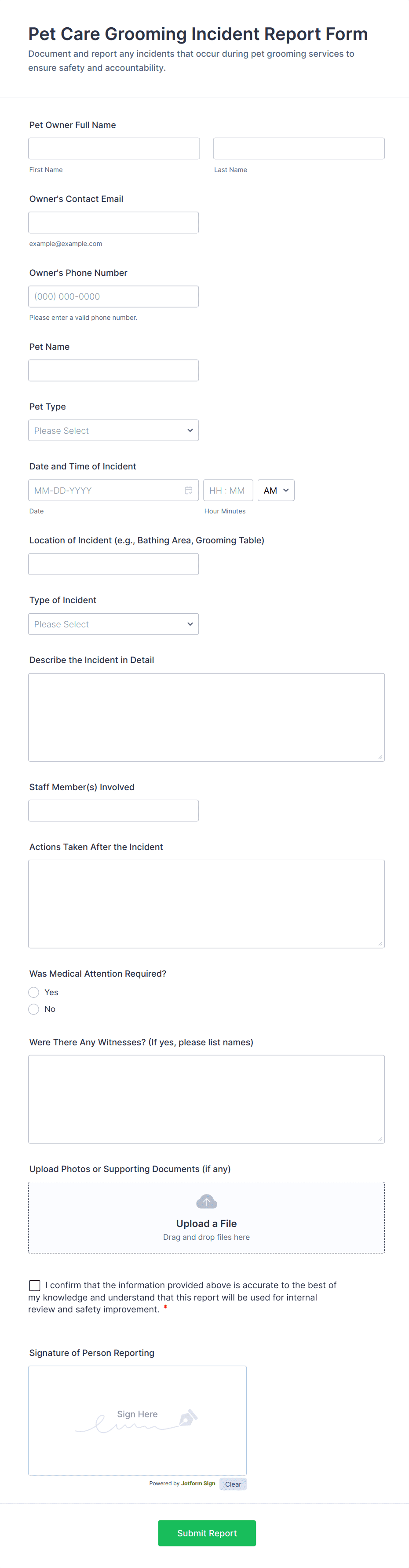 Jotform uses secure data storage and encryption to protect sensitive information. Access to submissions can be restricted to authorized personnel only.