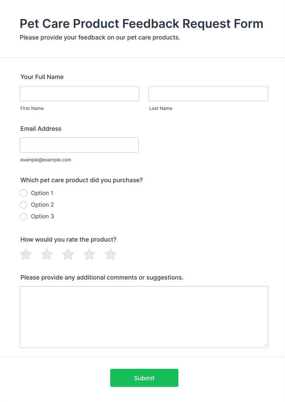 Product Survey Templates are pre-designed forms specifically created to help businesses, product managers, marketers, and researchers gather valuable feedback about products from customers, users, or stakeholders. These templates are used to assess customer satisfaction, collect suggestions for improvement, evaluate product features, and understand user experiences. Product survey forms can be utilized at various stages of a product’s lifecycle — from initial concept testing and beta launches to post-purchase feedback and ongoing product improvement. Common use cases include new product feedback, feature prioritization, usability testing, and post-launch satisfaction surveys.
