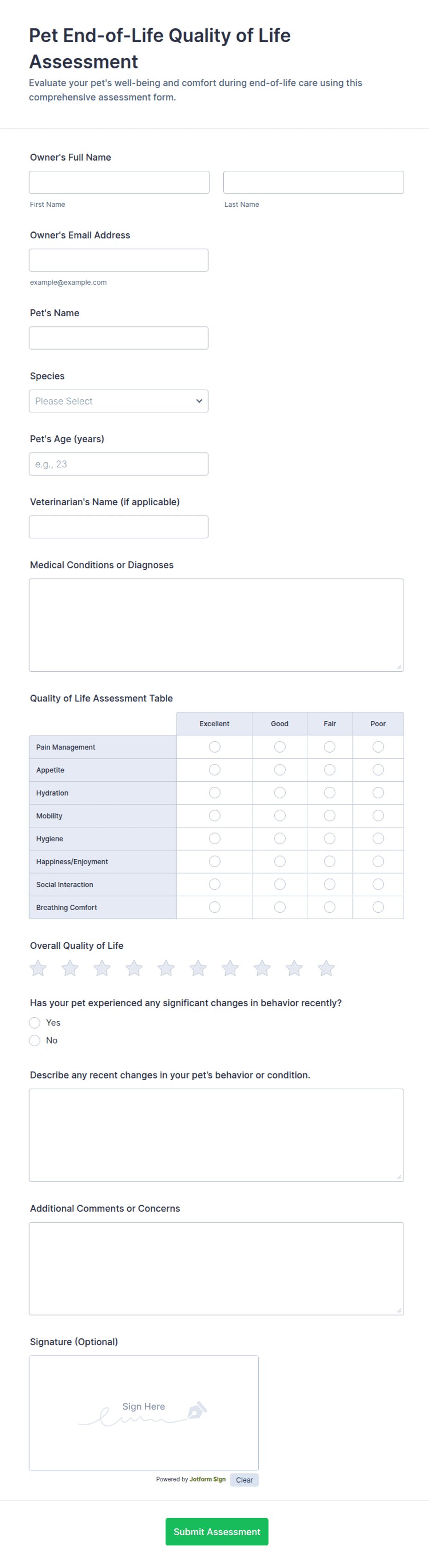 Veterinary EMR is a form template that assists veterinarians and pet clinics in tracking medical records of their patients, made user-friendly and customizable with Jotform's intuitive design tools.