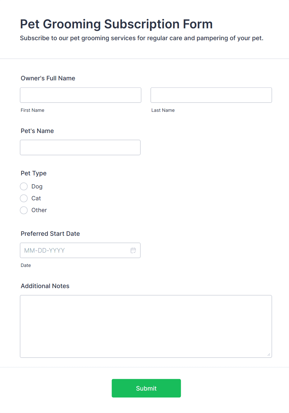 • For service orders, include fields like date/time pickers, dropdowns for service types, and text fields for special instructions.