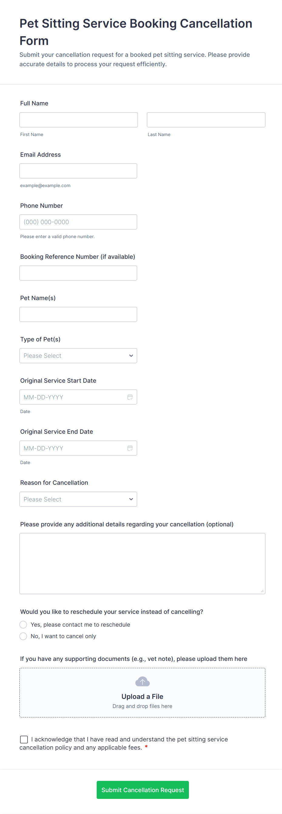 • For payment-related cancellations, include fields for refund preferences or payment details.