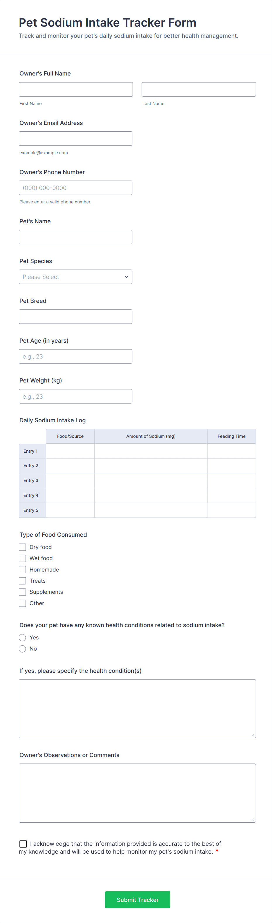 Common fields include owner and pet details, service selection, appointment preferences, medical history, consent signatures, and payment information.