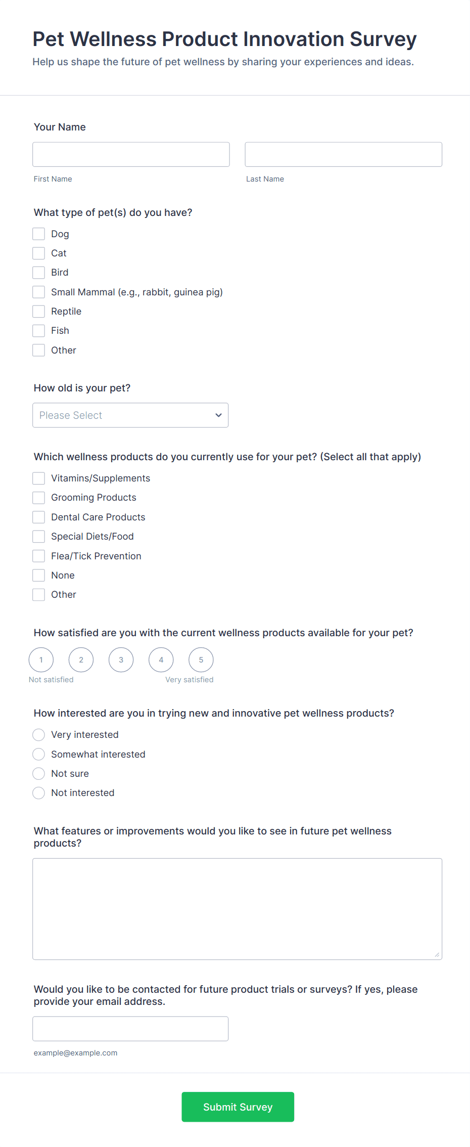 Product Survey Templates are pre-designed forms specifically created to help businesses, product managers, marketers, and researchers gather valuable feedback about products from customers, users, or stakeholders. These templates are used to assess customer satisfaction, collect suggestions for improvement, evaluate product features, and understand user experiences. Product survey forms can be utilized at various stages of a product’s lifecycle — from initial concept testing and beta launches to post-purchase feedback and ongoing product improvement. Common use cases include new product feedback, feature prioritization, usability testing, and post-launch satisfaction surveys.