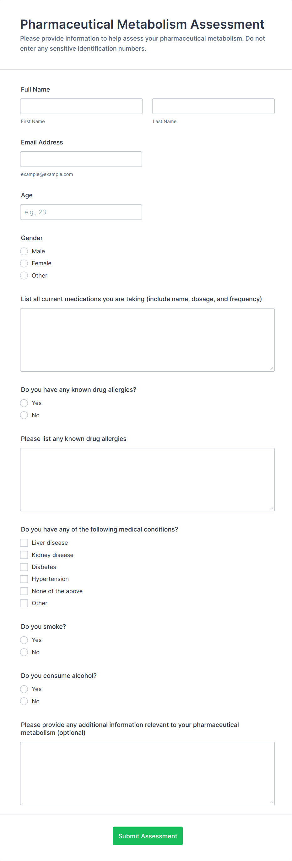 Add fields for symptoms, medical history, medications, allergies, lifestyle factors, and functional status depending on the assessment type. Use rating scales for severity and impact.