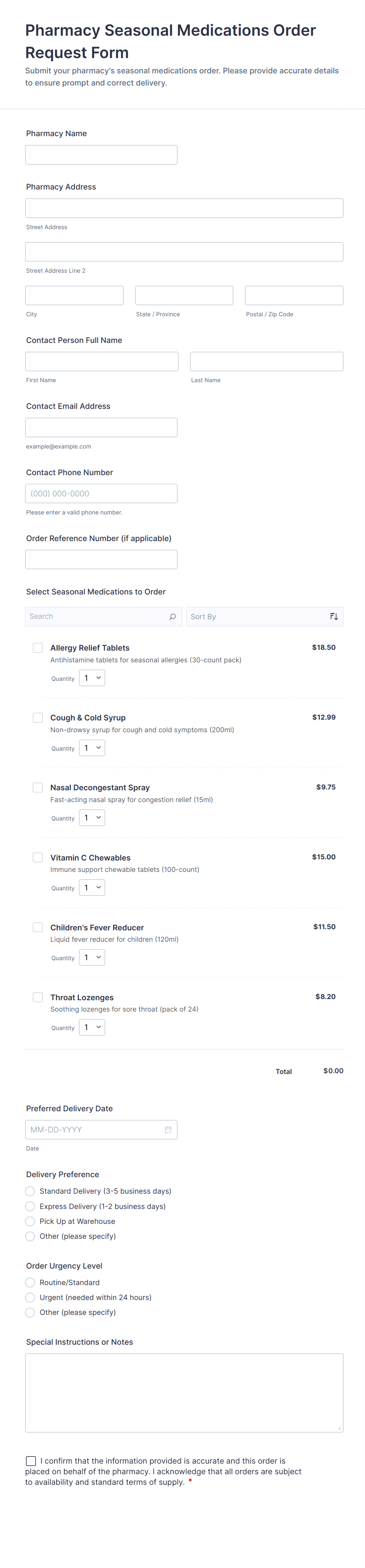 • For vendor orders, include supplier contact fields and delivery instructions.