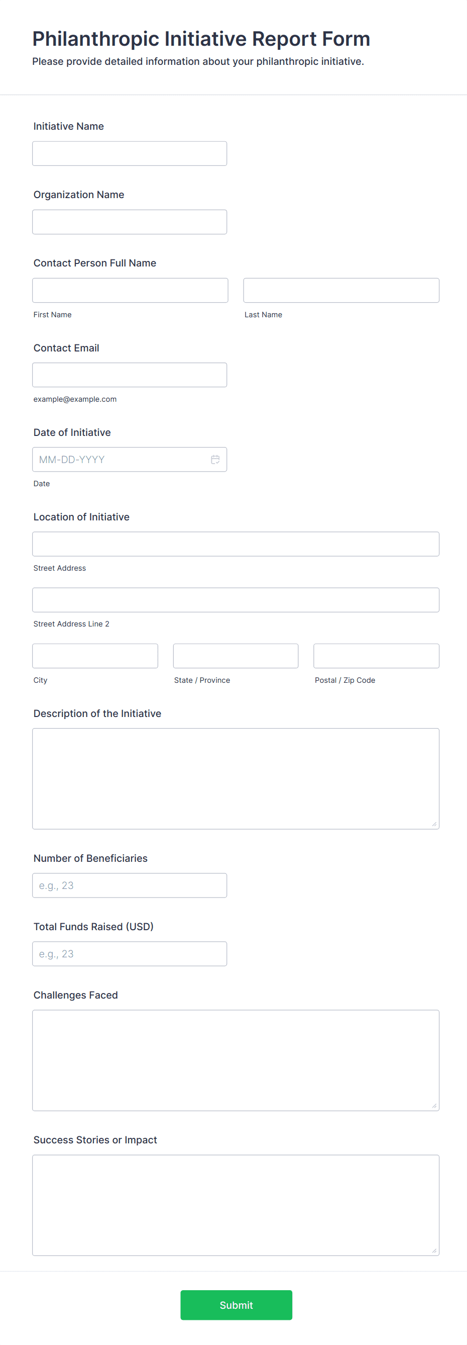 Donation forms are specialized online forms designed to collect contributions for charitable organizations, fundraising campaigns, nonprofit initiatives, and community projects. These forms streamline the process of gathering donor information, processing payments, and tracking contributions, making it easier for organizations to raise funds efficiently. Donation forms can be used for a variety of purposes, such as one-time or recurring donations, event sponsorships, crowdfunding efforts, membership drives, and emergency relief campaigns. They are essential tools for nonprofits, schools, religious groups, and community organizations seeking to engage supporters and facilitate secure, convenient giving.