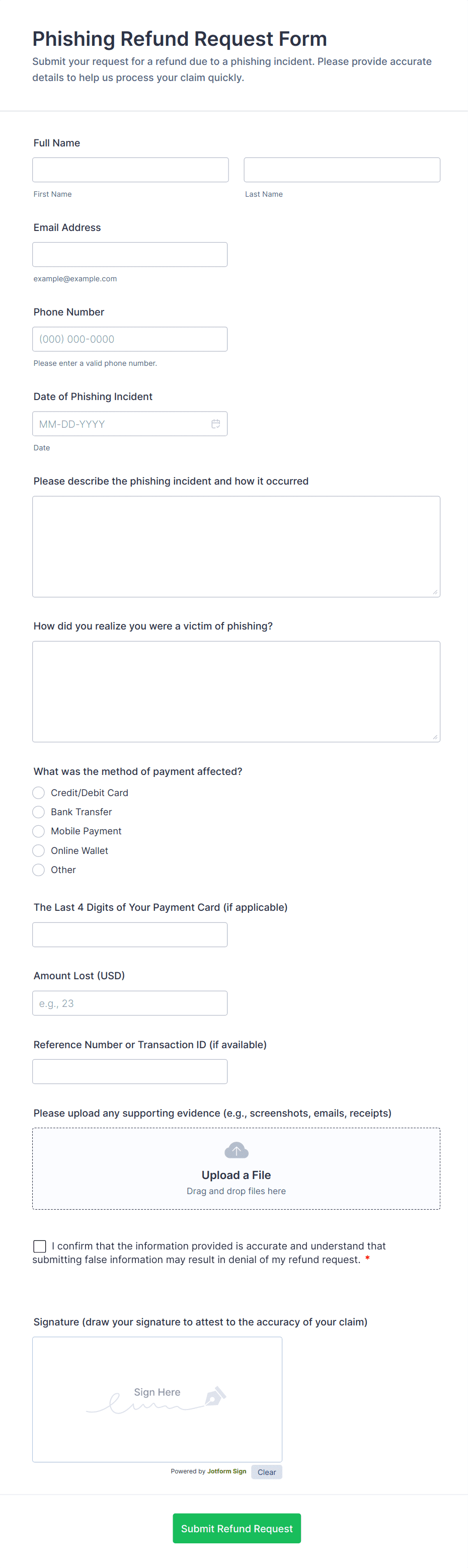 Refund Form Templates are specialized online forms designed to streamline the process of requesting, processing, and managing refunds across a variety of industries. Whether you’re running an e-commerce store, a service-based business, an event organization, or a school, refund forms help you collect all the necessary information from customers or clients who wish to request a refund. These templates typically include fields for order details, reasons for the refund, payment information, and supporting documentation, ensuring that refund requests are handled efficiently and transparently. Use cases range from product returns and event ticket refunds to tuition reimbursements and subscription cancellations.